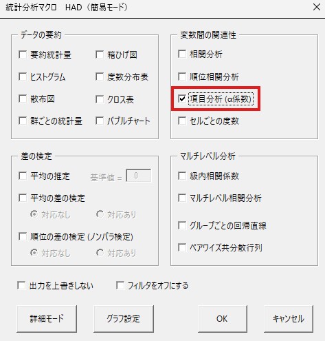 表示されたポップアップ画面で、右上の方にある「項目分析(α係数)」にチェックを入れます。