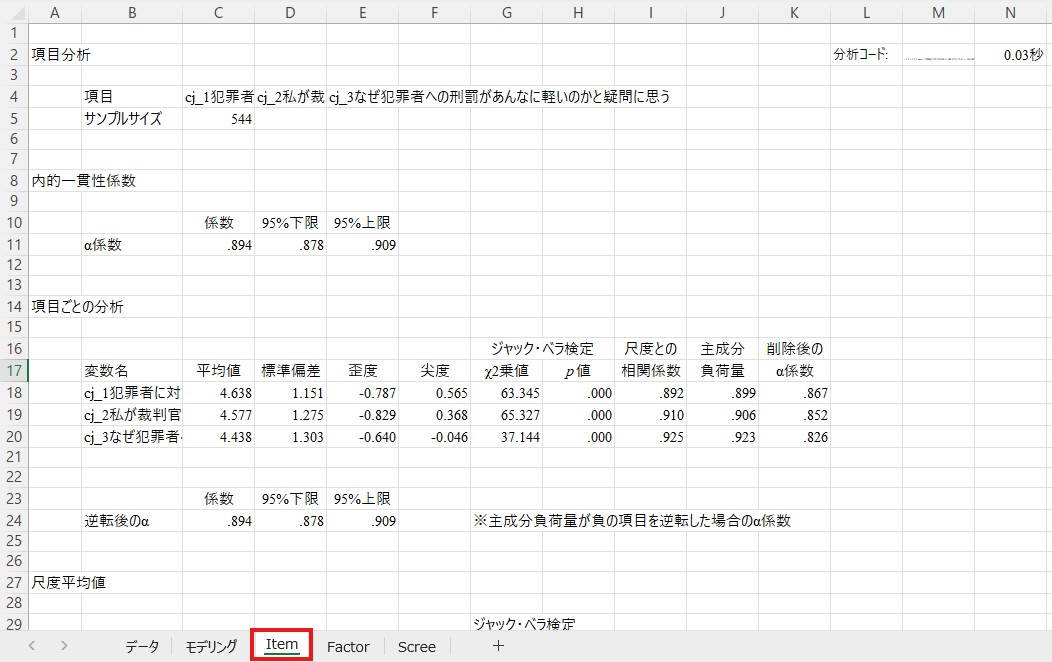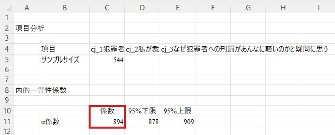 信頼性係数は上の方の「α係数」の横に表示されています。ここでは.864が厳罰傾向のα係数です。一般にα係数は.70以上であれば問題ないとされますので、ここでは特に問題はなさそうですので先に進みます。
