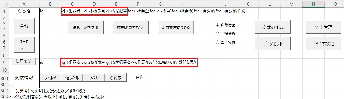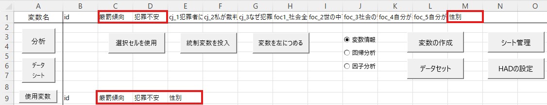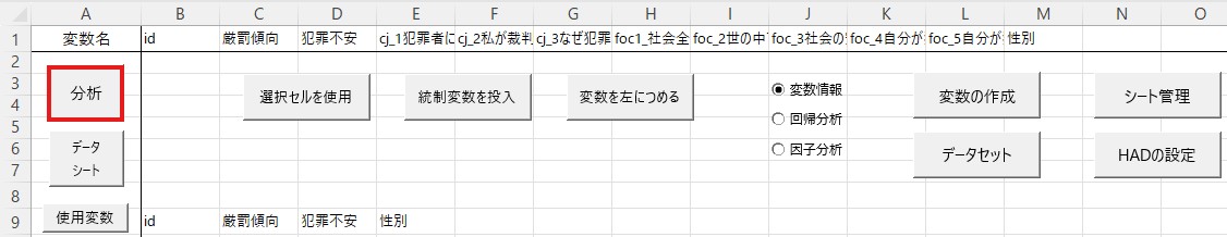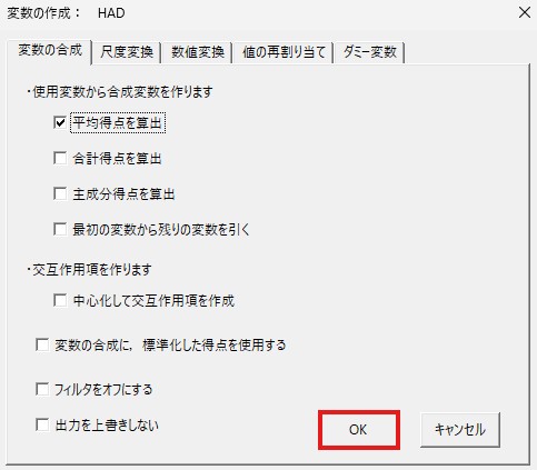 ここまでで厳罰傾向を測定する5つの項目を1つの変数として扱っていいことが分かりましたので、次はこれらの5項目の平均値を算出し、それを厳罰傾向の値とします。合成変数の作成にはエクセルのaverage関数を使うやり方もありますが(関数を使ったことがある方にとってはおそらくそちらの方が通常楽です)、ここではHADの機能を使ったやり方を解説します。