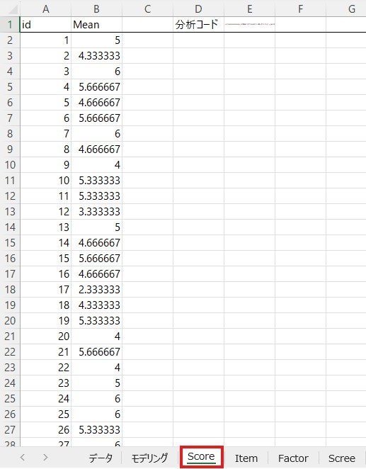「Mean」の列には「使用変数」に入力した項目の平均値が入っています。ここでは5つの項目を入力しましたので、その5つの項目の平均値が計算されています。