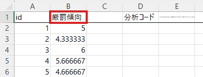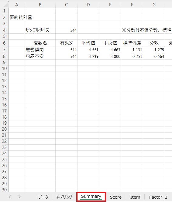 「平均値」と「標準偏差」の列にそれぞれの値が表示されています。たとえばここでは厳罰傾向の平均値は4.551、標準偏差は1.131であることが分かります。