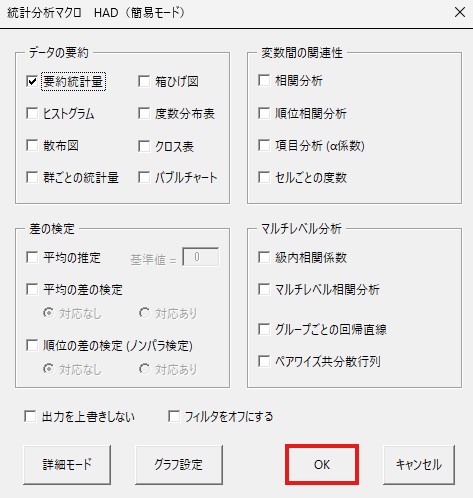 表示されたポップアップ画面で、左上の方にある「要約統計量」にチェックを入れてください。