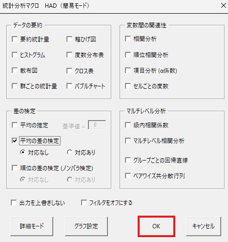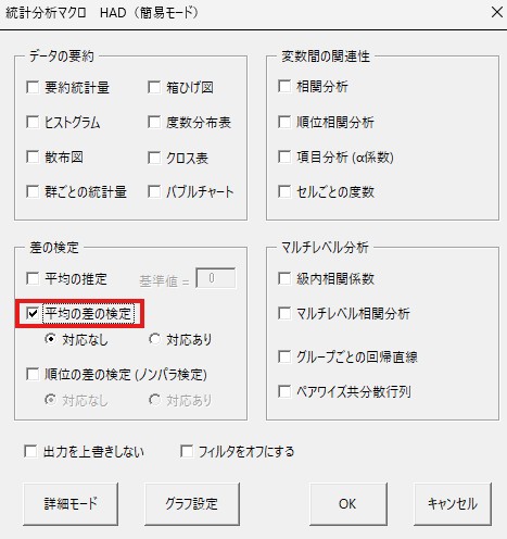 表示されたポップアップ画面で、左下の方にある「平均の差の検定」にチェックを入れてください。その下にある「対応なし」と「対応あり」については変えなくて大丈夫です。