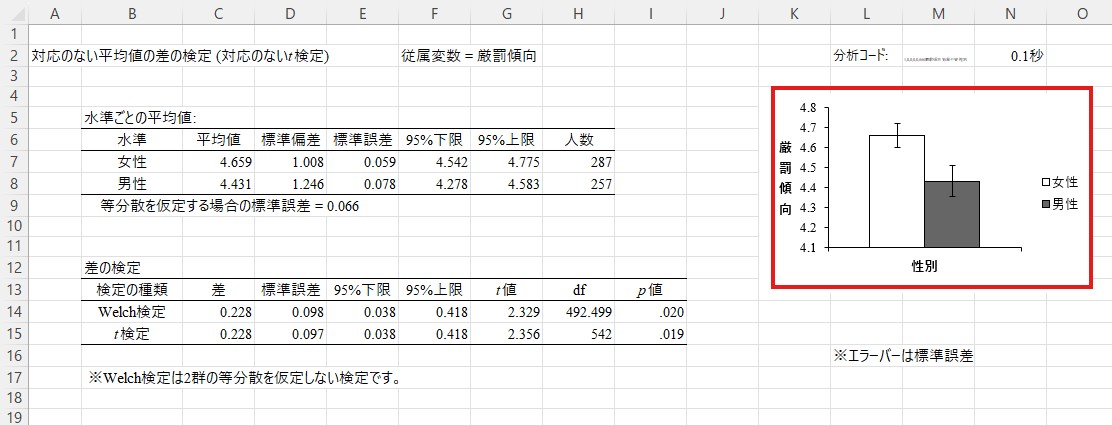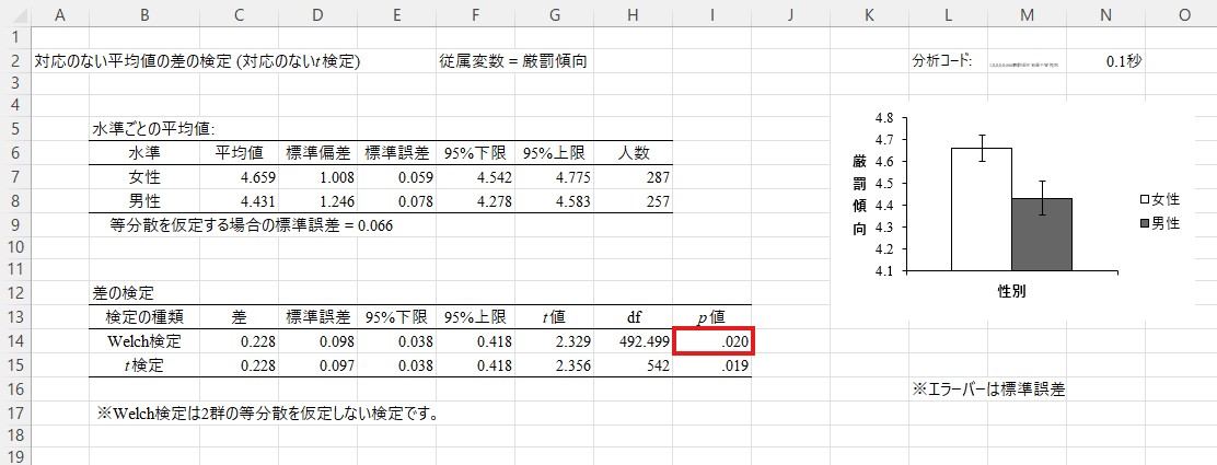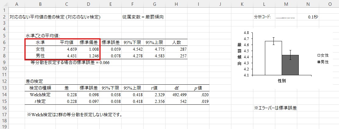 ここでは厳罰傾向に関する結果(「Ttest1)を見てみましょう。まず細かい数字を見る前に右にある図を見てください。ここでは条件ごとの平均値が図示されています。女性の方が男性よりも平均値が高くなっています。このデータでは値が大きいほどが厳罰的であることを示すようにコーディングされていますので、女性の方が厳罰的であるようです。