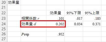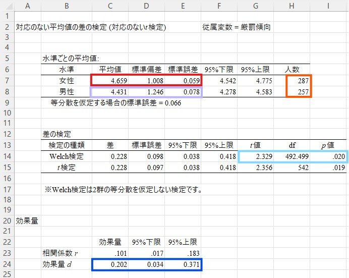 最後に、一番下の「効果量」を見てください。ここまでの分析では、厳罰傾向には有意な男女差があることが示されました。しかし、この差がどれくらい大きいのかは分かりません。これを補うのが効果量です。「効果量d」を見ると、0.202という値になっています。一般に効果量dは0.20程度であれば小さい、0.50程度であれば中程度、0.80程度であれば大きいと判断します。そのため、ここでの効果量は「小さい」ということになりそうです。