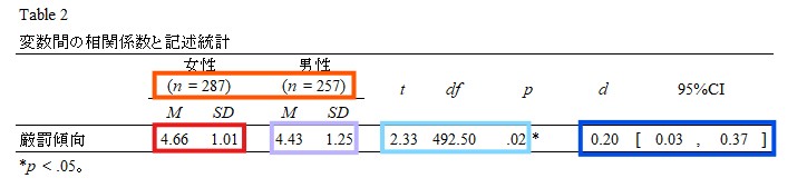 以上の結果をまとめると、厳罰傾向には有意な男女差はあるが、その差は小さいと判断することになります。