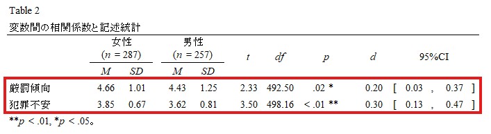 作成された2つの変数についてt検定を行った。まず厳罰傾向については,男性(M = 4.43, SD = 1.25)と比べて女性(M = 4.66, SD = 1.01)の方が平均値が高いことが示された(t(492.50) = 2.33, p = .02, d = 0.20, 95%CI [0.03, 0.37])。犯罪不安についても同様に,男性(M = 3.62, SD = 0.81)と比べて女性(M = 3.85, SD = 0.67)の方が平均値が高いことが示された(t(498.16) = 3.50, p < .01, d = 0.30, 95%CI [0.13, 0.47])